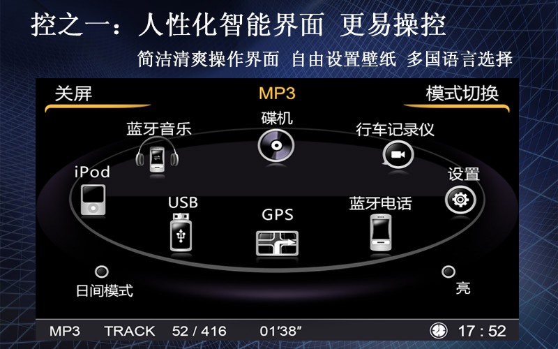 人性化操作界面,简洁大方,更易操控,同时,用户可自由设置壁纸,界面风格自由定义。并提供多国语言选择,爱好外语的车主,也可以随心转换。