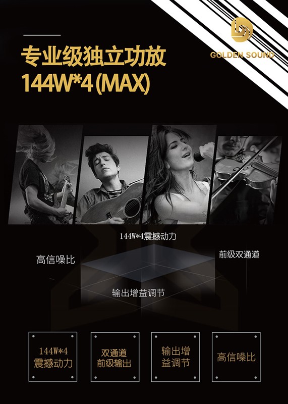 144W*4(MAX)/ 72W*4(额定)媲美独立专业功放,增益音源表现力,带来更优质音乐享受。双通道低音前级输出,连接外置低音炮,低音炮正反相位,畅享混响、和声、镶边等澎湃律动,叫醒深埋的野性能量。