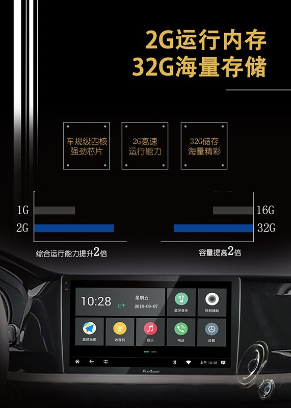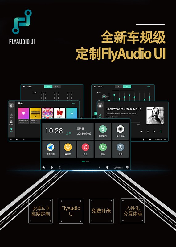 Android6.0高度定制系统,车规级全新FlyAudio UI,符合车载安全驾驶操作习惯的设计,由繁入简,信息聚合,人性化交互呈现,全新定制车载级系统。