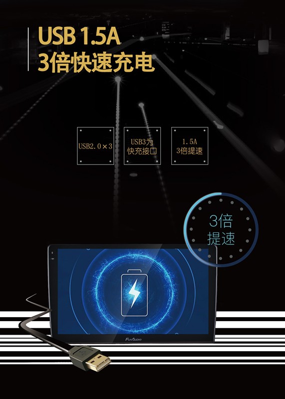 支持USB 1.5A快速充电,达到普通车机充电的3倍速度。出门在外,手机没电,飞歌X1智能音乐车机1.5A快速充电高效传输,让你体验快速充电的魅力。