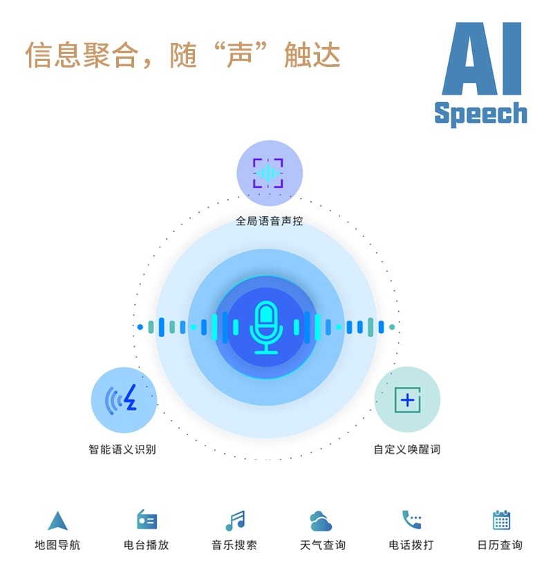 本产品采用AI Speech智能语音操控,可以实现流畅的语音交互,通过与高德地图、酷我音乐、喜马拉雅FM等第三方公司进行合作,集成了丰富的娱乐内容,为广大车主提供全方位车载指令服务。