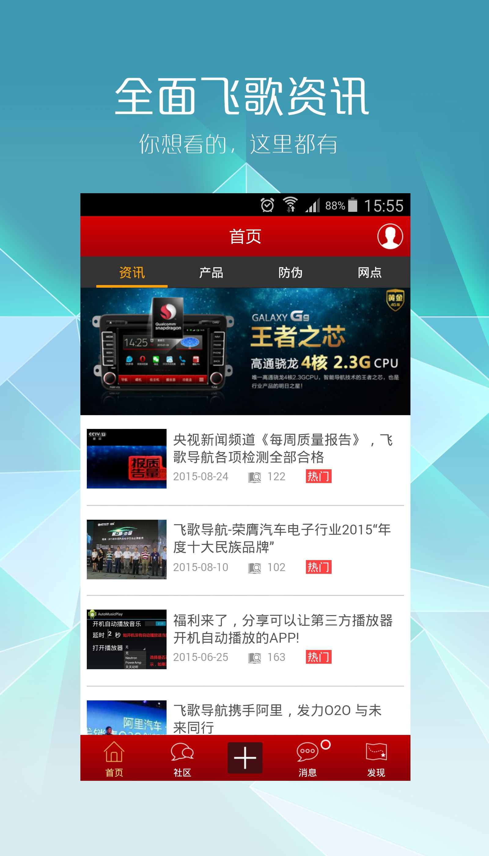 飞歌论坛APP将为所有飞歌客户提供行业新闻资讯、产品在线搜索和介绍、全国经销商实时查询以及在线防伪验证等实用讯息。
