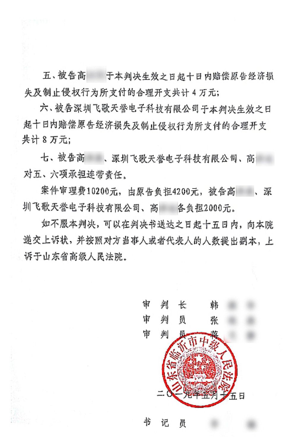 对此,我司已提出警告并于 2018年6月在山东省临沂市中级人民法院起诉相关不正当竞争方深圳飞歌天誉电子科技有限公司、高某某(女)及高某某(男)侵权行为,提出维权主张,并于近日正式审理终结。